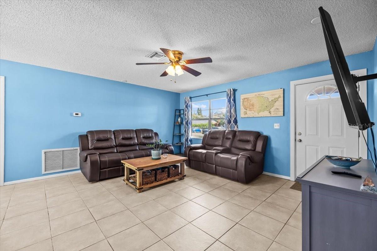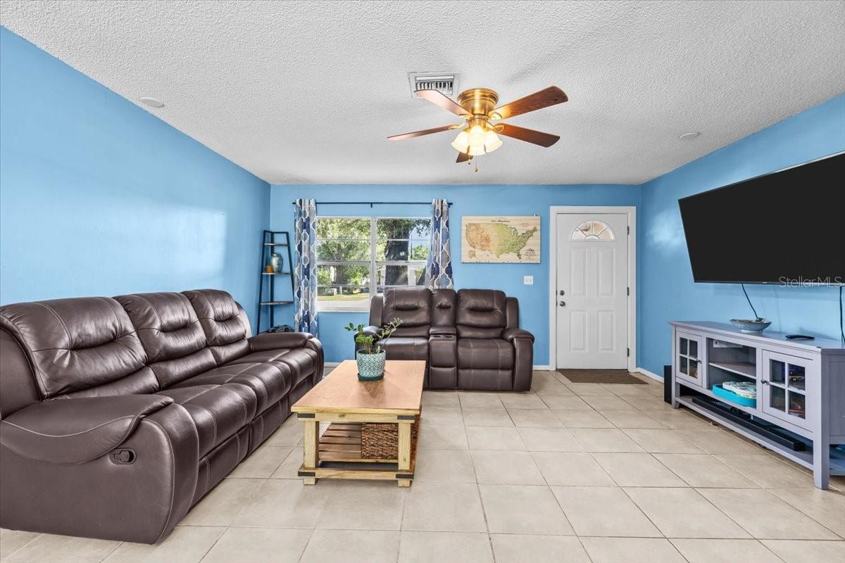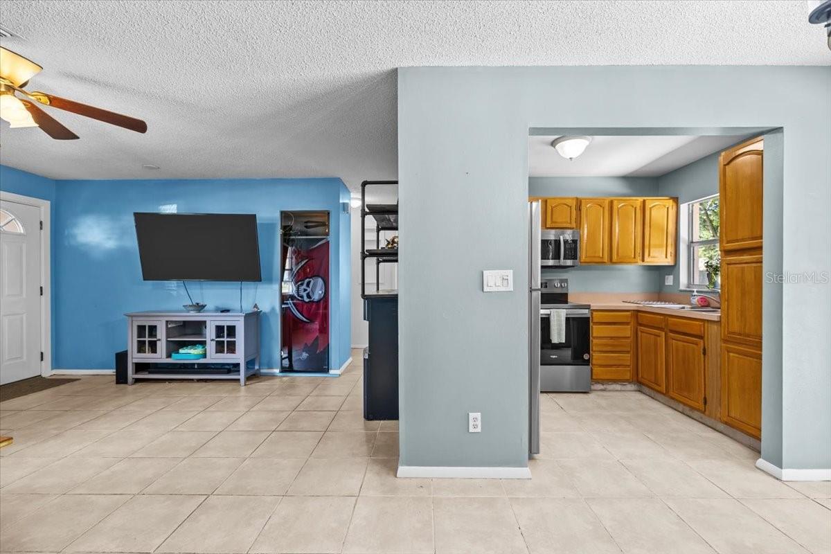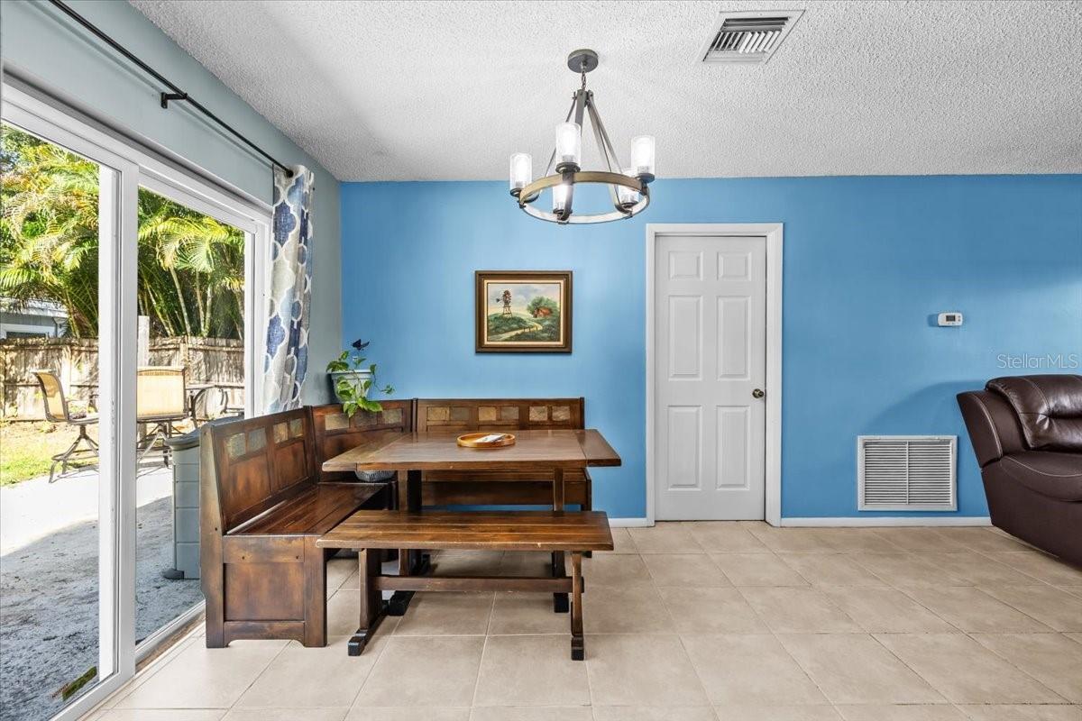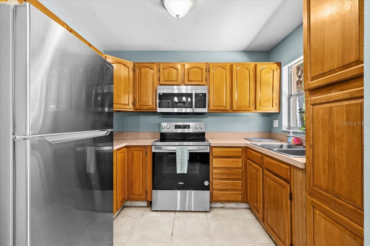 The kitchen includes brand-new stainless steel appliances (refrigerator, microwave, and stove – all installed September 2025), plus ample cabinet space for storage. A newer sliding glass door (2022) opens to the backyard, creating easy indoor-outdoor flow.