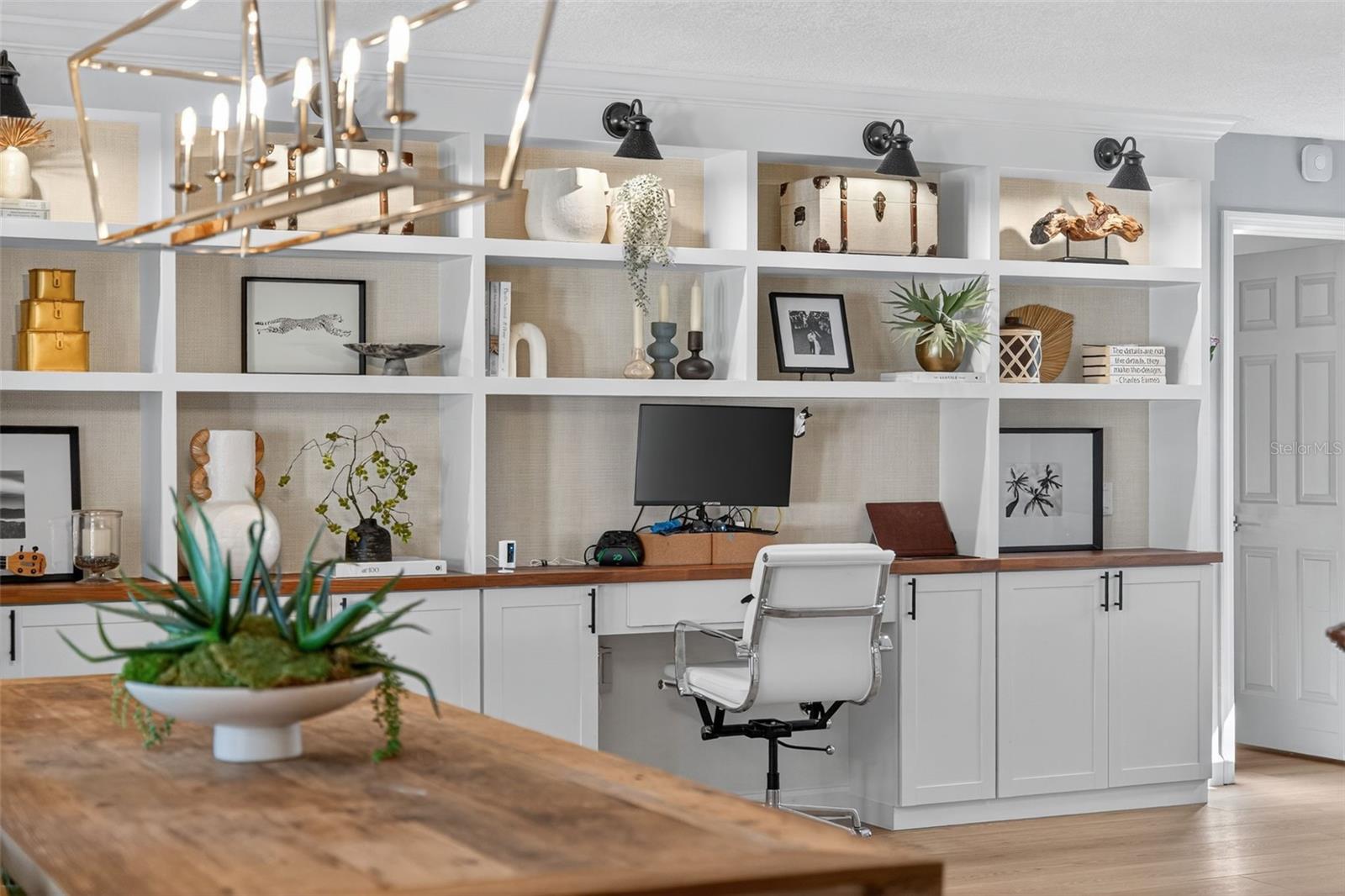 The main living area includes custom cabinetry ideal for a home office or display space, while the secondary bedroom offers built-in shelving and a Murphy bed and walk in closets perfect for guests or multi-use living. The spacious primary suite includes a walk-in closet with custom organization.