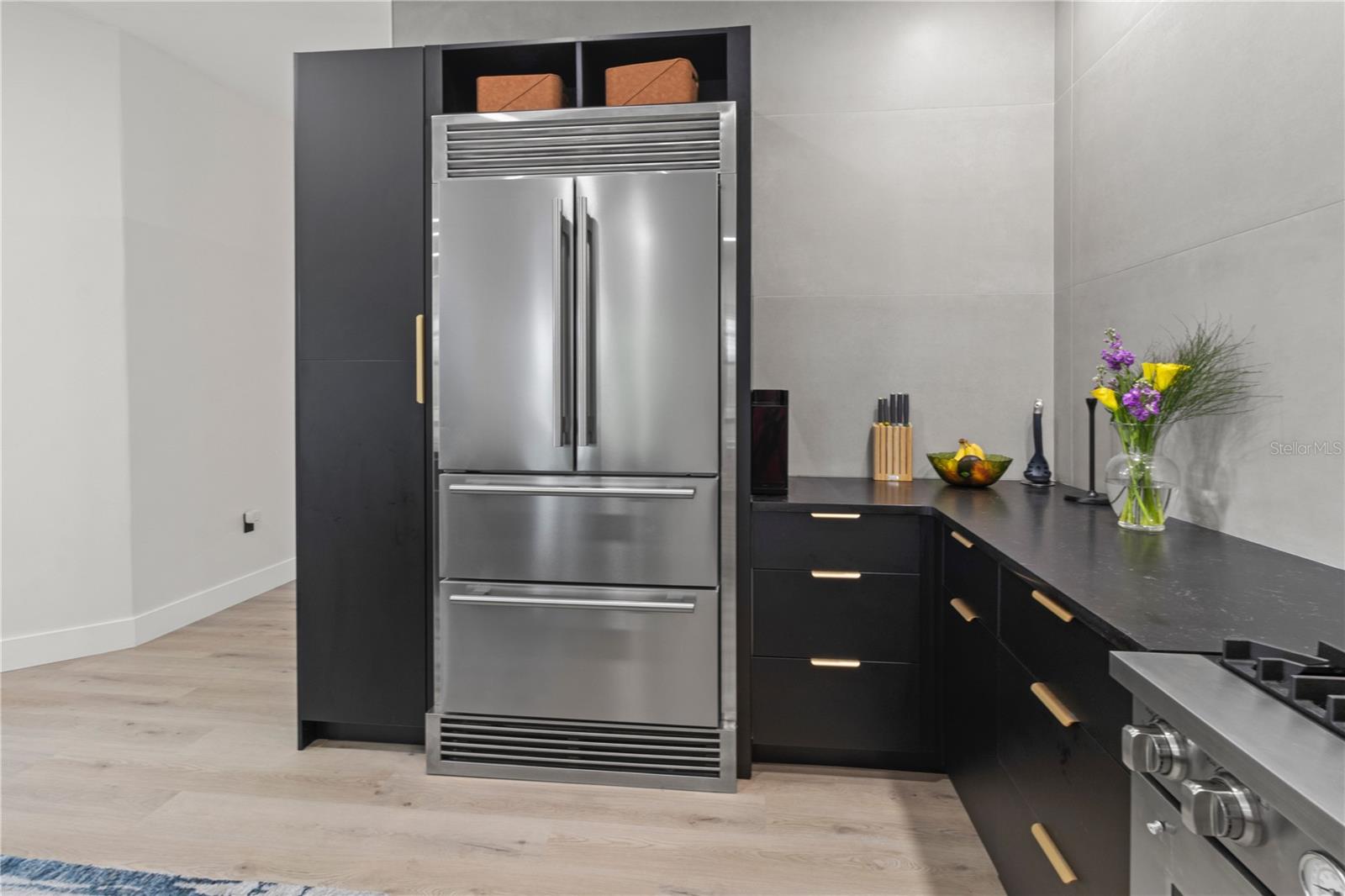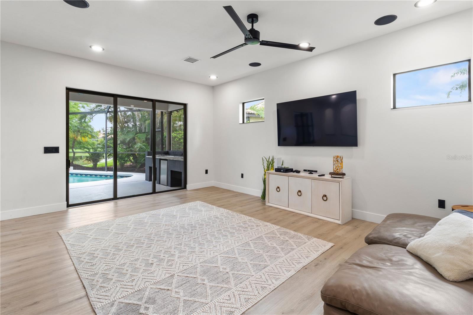 Inside, the home delivers a modern luxury experience with a double split floor plan, soaring high ceilings, graceful archways, abundant natural light, and hurricane-rated impact windows. The Primary Owner's Suite sits privately behind its own hall and features direct pool access. Designer upgrades include waterfall countertops, NEW gourmet-style premium appliances, floating vanities, wall-mounted toilets, zero-entry showers with handhelds, Moen fixtures, a spa-inspired primary bath with four Bluetooth-controlled showers, a walk-in closet, and floor-to-ceiling tile in all bathrooms and the laundry room. A Restoration Hardware chandelier sets the tone from the moment you enter.