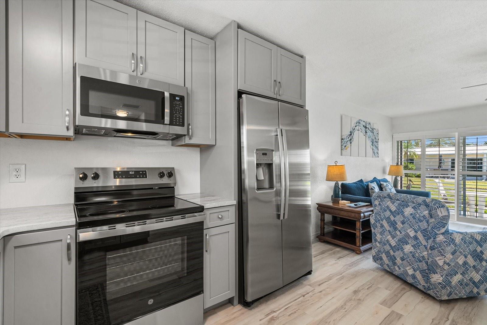 The open-concept floor plan showcases luxury vinyl plank flooring throughout, creating a seamless flow from the spacious kitchen to the dining area and inviting living room. Soft coastal hues and sliding glass doors with plantation shutters fill the space with natural light and add a touch of island character.