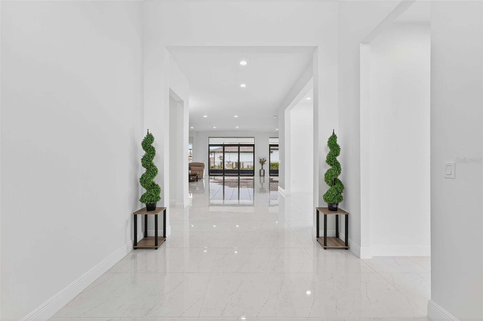 The open-concept floor plan showcases a gourmet kitchen with upgraded cabinetry, quartz countertops, stainless steel appliances, and an oversized island—ideal for entertaining. The spacious living area features custom details and large hurricane impact sliders that open to your private outdoor oasis.